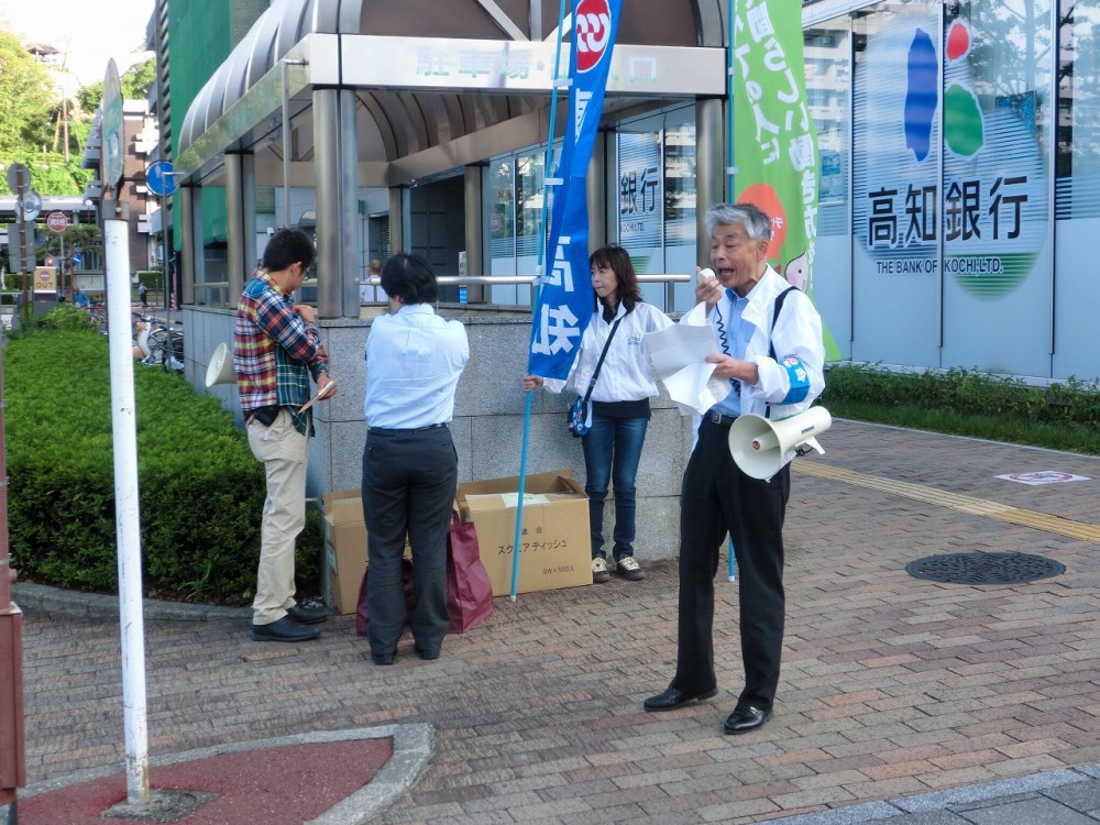 街宣では、「誰でも安心して働けるワークルール実現をめざす」ことを訴えるチラシとティッシュを、朝の通勤者に手渡して働く仲間の連帯を呼び掛けました。
