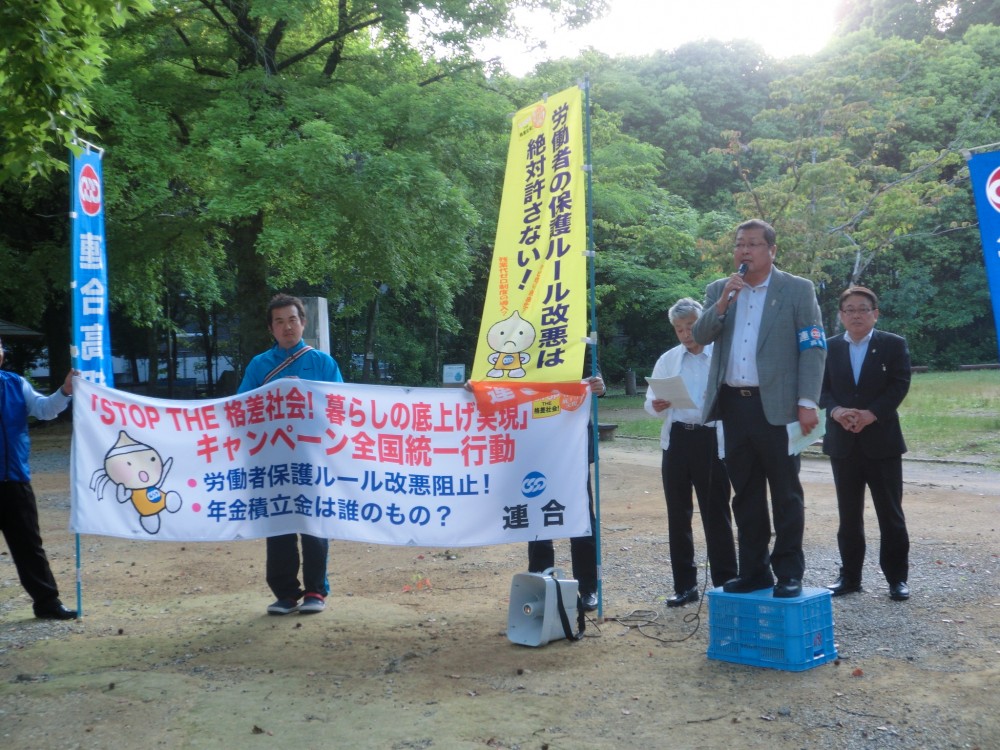開催にあたって挨拶した間嶋会長は「この集会は、連合高知がこれから取り組む県内一円の街宣行動の皮切りになる集会だ。労働者保護ルール改悪を許さない声を役員だけでなく職場、地域からあげていこう」と檄を飛ばした。