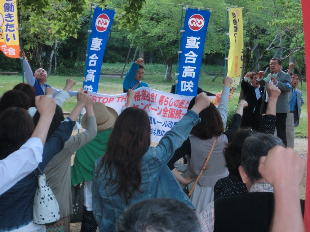 これからの行動提起では、折田事務局長より「当面の目標は、法案を廃案に持ち込むことだ。改悪の意図は正社員ゼロに向けた第一歩を踏み出すことと、労働時間の規制を否定するものであり、私たちの働き方を否定するものだ。いま労働者が立ち上がらずいつ立ち上がるのか。今こそ、廃案に向けて職場、地域から取り組みを進めよう」と訴えた。