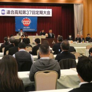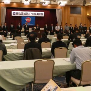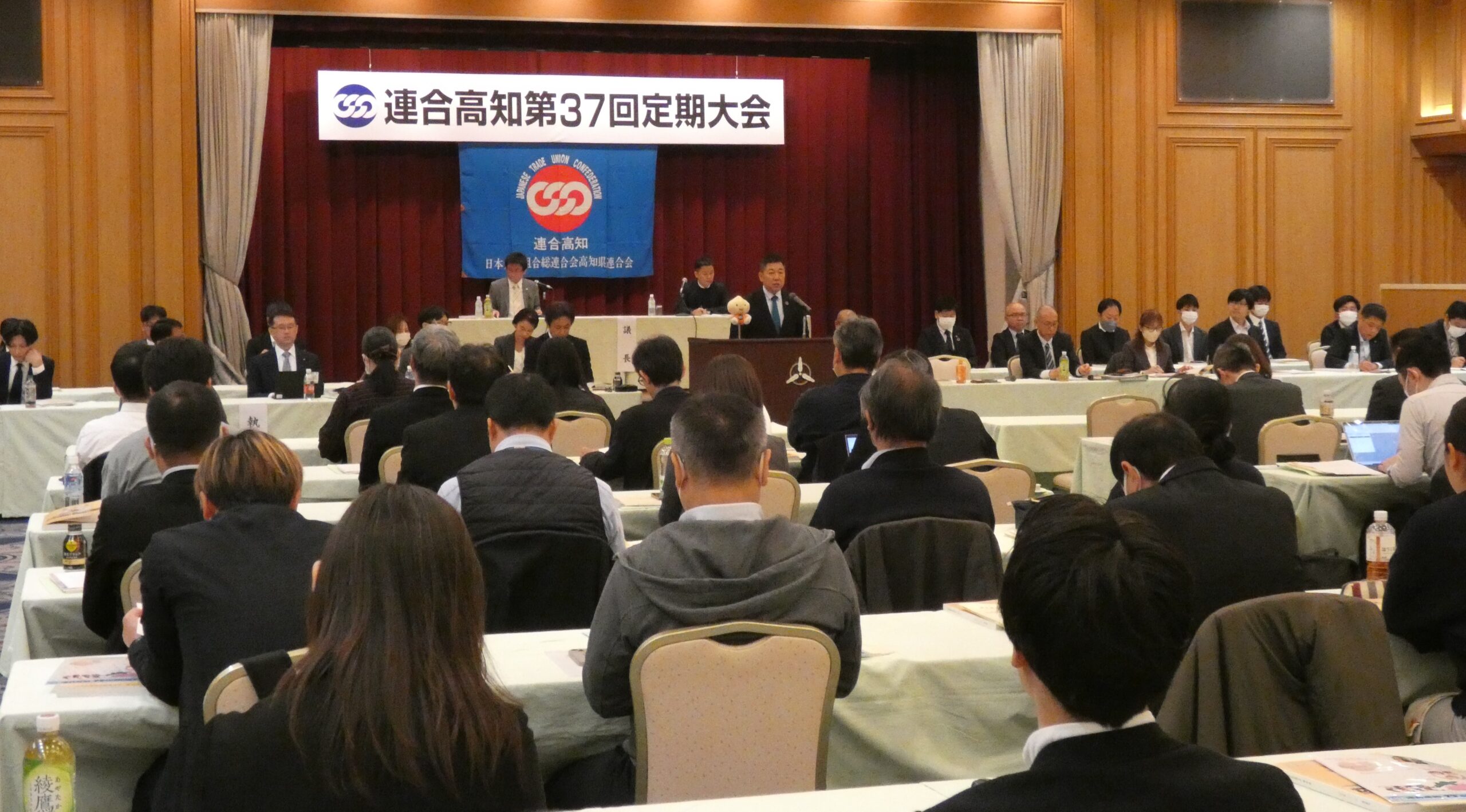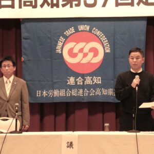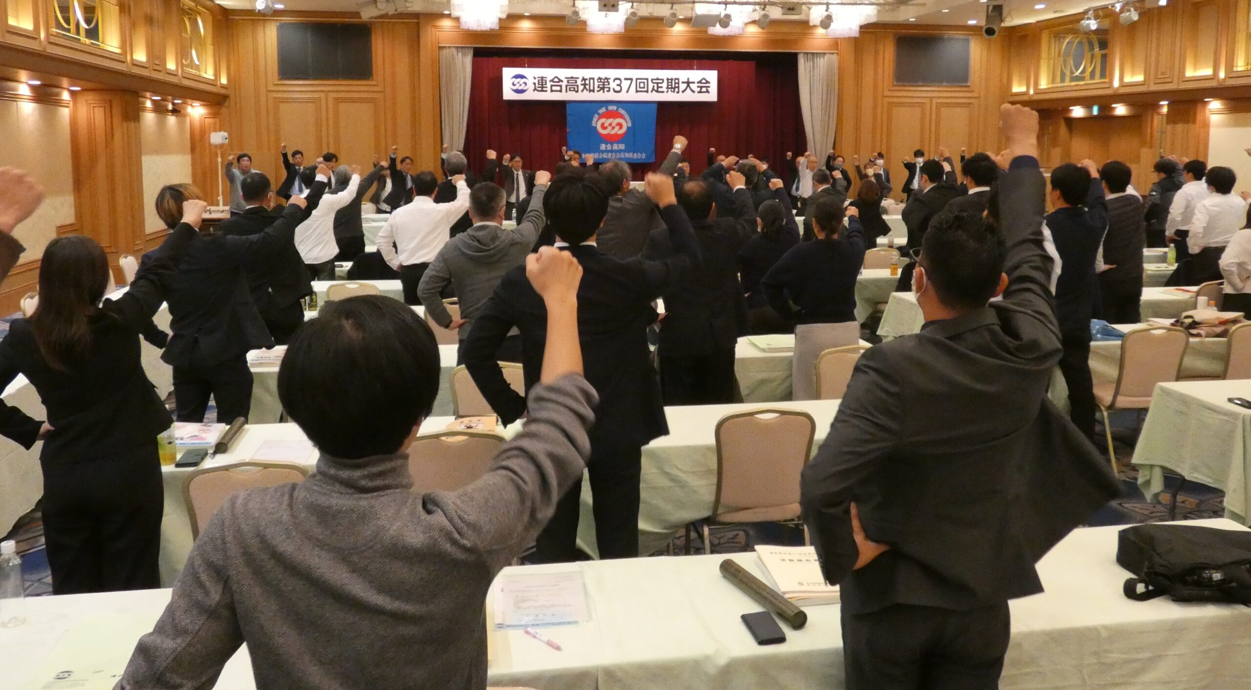 連合高知は11月12日、三翠園で第37回定期大会を開催した。この大会には代議員67名(うち女性15名)、特別代議員3名、女性特別代議員7名、執行部25名が参加し、「ⅰ.2025年度活動報告、ⅱ.2025年度一般・特別会計決算報告および会計監査報告、ⅲ.2025年度剰余金処分について、ⅳ.2026~2027年度運動方針、ⅴ.2026春季生活闘争について、ⅵ.連合高知「第27回参議院選挙 総括」、ⅶ.高知県連合会規約および会計処理規定、大会運営規定の改正ついて、ⅷ.2026年度一般・特別会計予算、ⅸ.役員選出について、ⅹ.表彰について」審議・承認した。