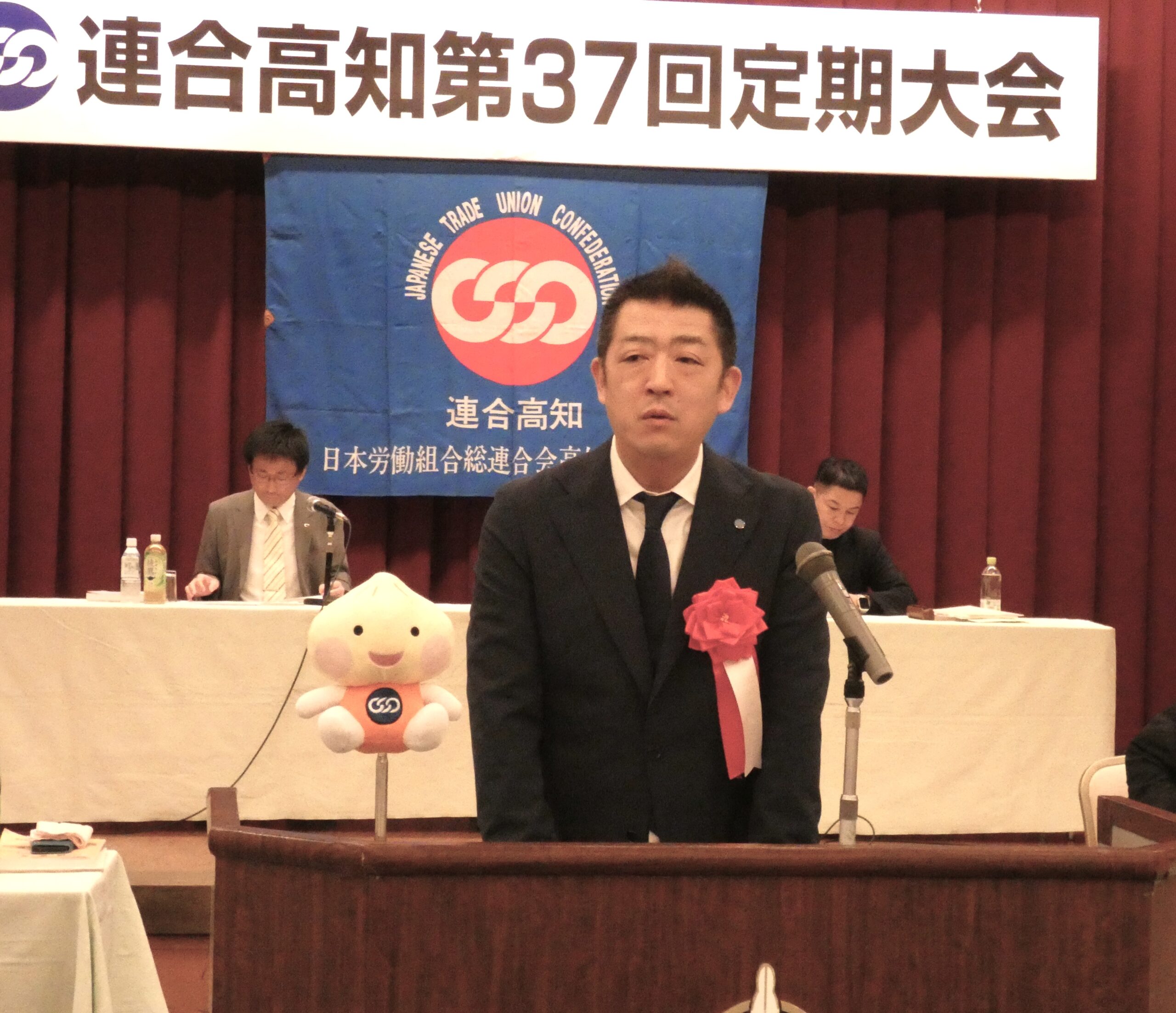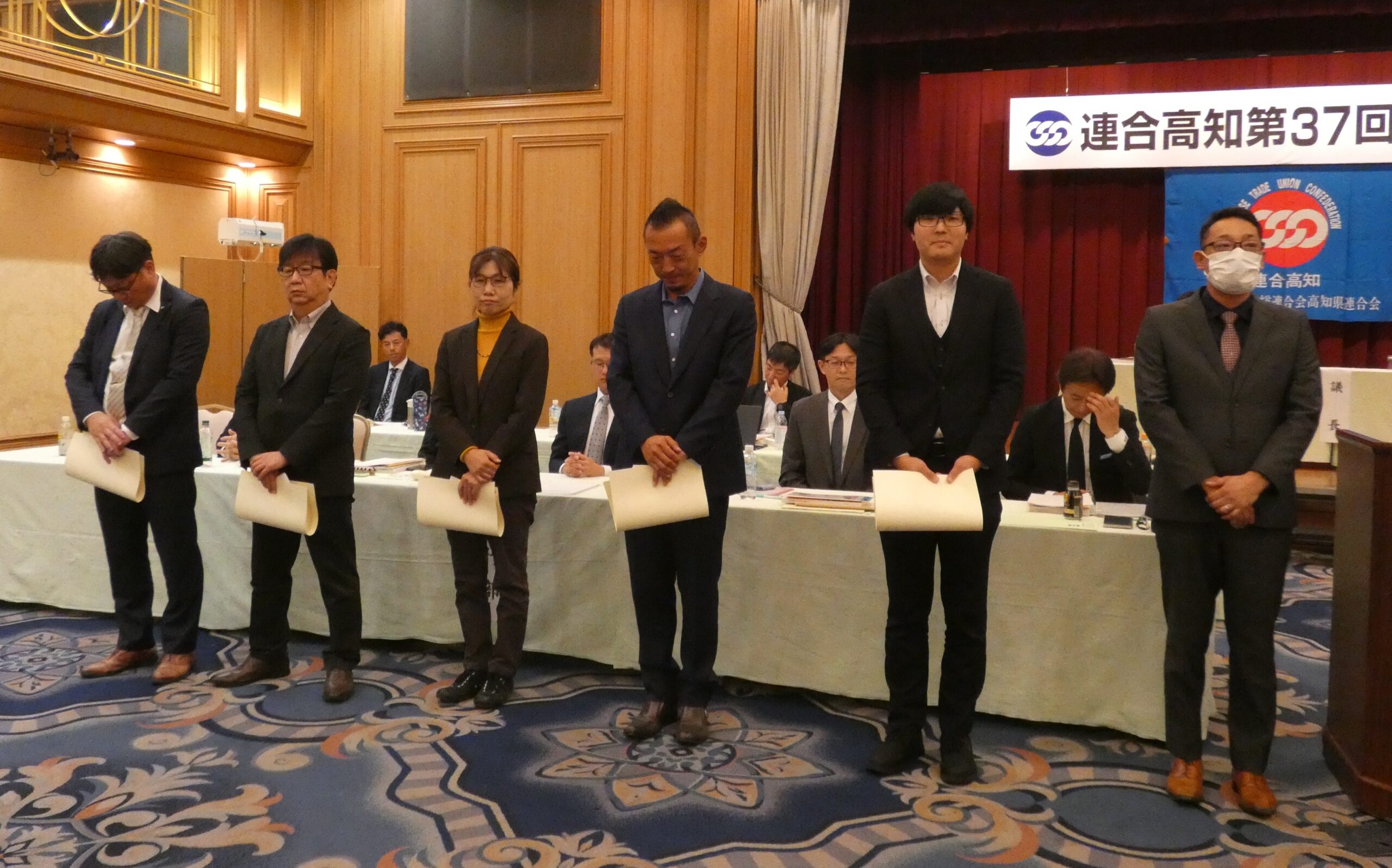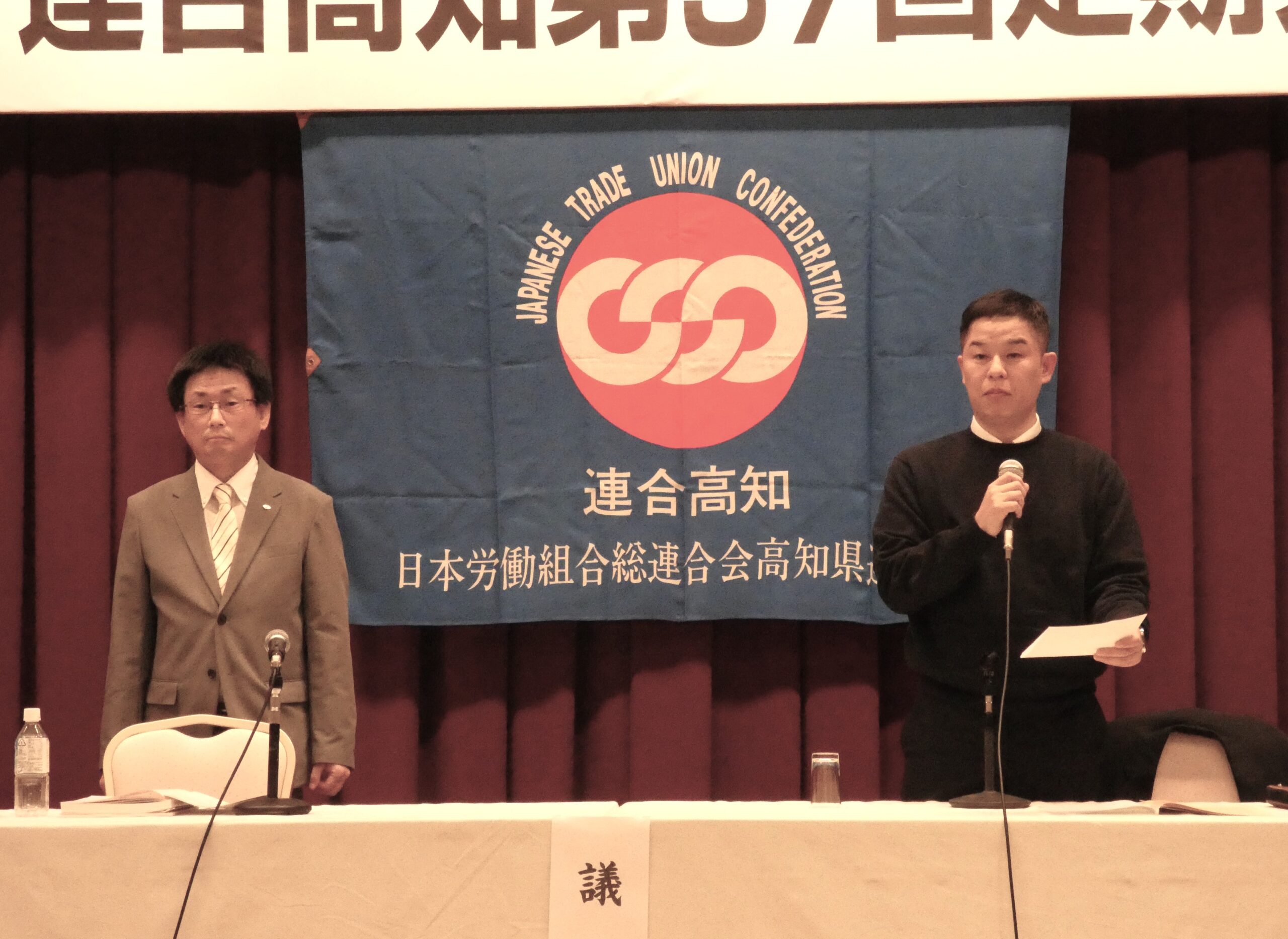 連合高知は11月12日、三翠園で第37回定期大会を開催した。この大会には代議員67名(うち女性15名)、特別代議員3名、女性特別代議員7名、執行部25名が参加し、「ⅰ.2025年度活動報告、ⅱ.2025年度一般・特別会計決算報告および会計監査報告、ⅲ.2025年度剰余金処分について、ⅳ.2026~2027年度運動方針、ⅴ.2026春季生活闘争について、ⅵ.連合高知「第27回参議院選挙 総括」、ⅶ.高知県連合会規約および会計処理規定、大会運営規定の改正ついて、ⅷ.2026年度一般・特別会計予算、ⅸ.役員選出について、ⅹ.表彰について」審議・承認した。