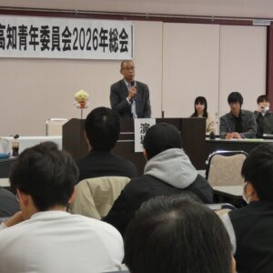 続いて、西本青年委員長からは、DXやAIの加速による業務効率化の取り組みが広がるなど、社会が大きく変化する一年を振り返り、「暮らしに直結する“賃上げ”や“物価高”、“働き方の見直し”といったテーマは、今年一年を通して大きく注目された。そんな中、7月に行われた第27回参議院議員選挙では、若年層の投票率は少し改善されたものの、引き続き政治への関心を高める取り組みが求められている。私たち青年世代は、これからの働く環境をつくっていく当事者だからこそ政治に無関心ではいられない。今年度は青年委員会で政治学習に取り組んだ。こうした活動を継続し、『声を届けることの大切さ』を発信することで、若い仲間がより積極的に選挙に参加できるよう取り組んでいく」と述べた。最後に、「誰かのために行動できる思いやりを持った皆さんだからこそ、今日もこうして集まっていただき活動ができているのだと思う。これからも一緒に支えあいながら頑張っていきましょう」と、力強いあいさつがあった。