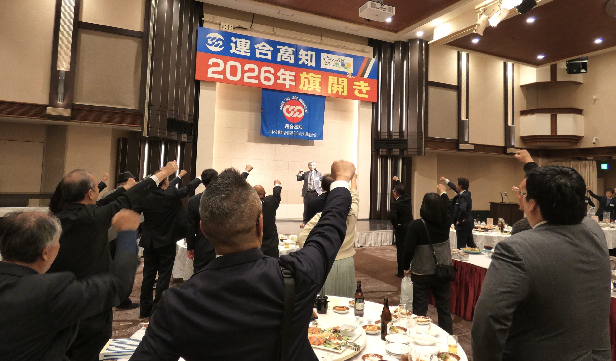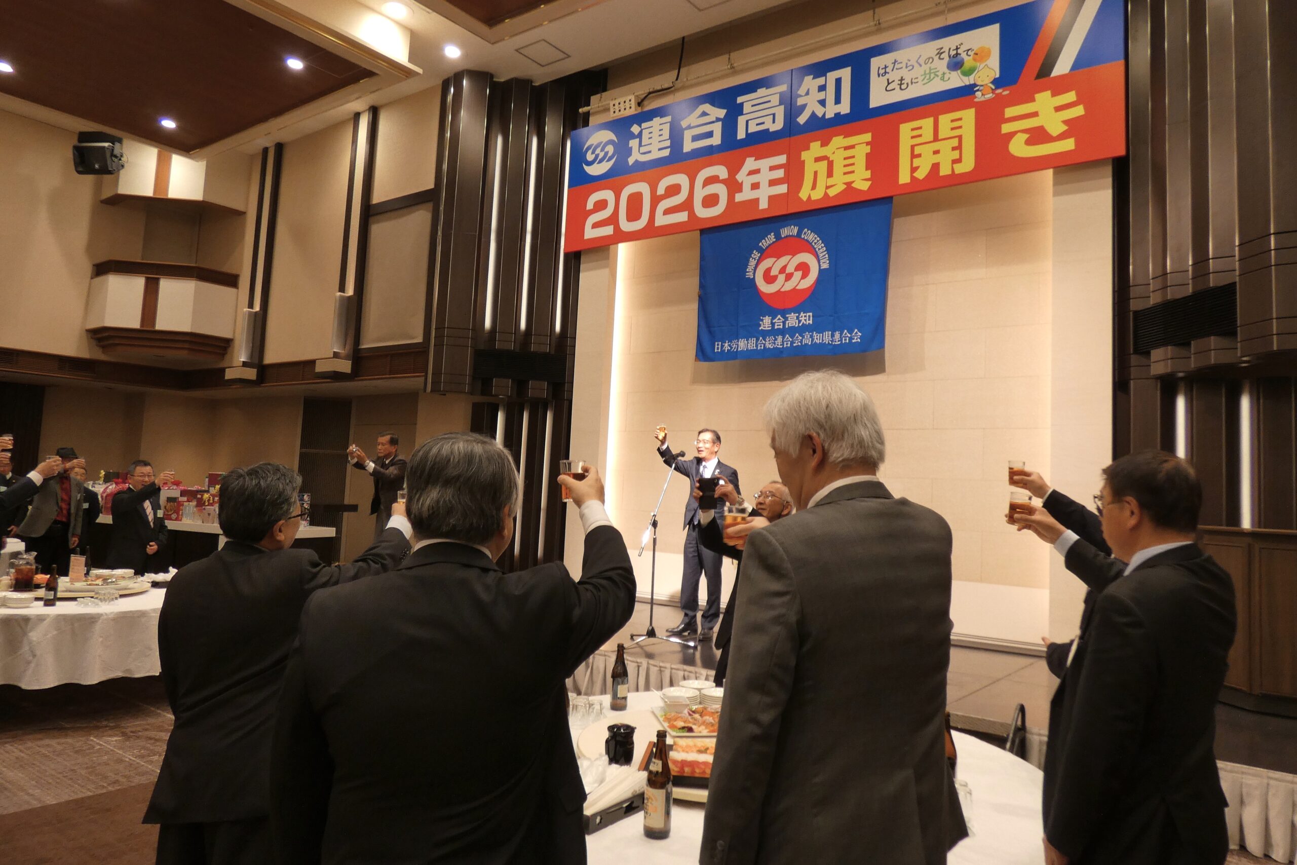 連合高知は1月8日、6年ぶりとなる新春恒例の旗開きを城西館で開催した。この旗開きには組合員190名、来賓63名が参加して親交を深めた。