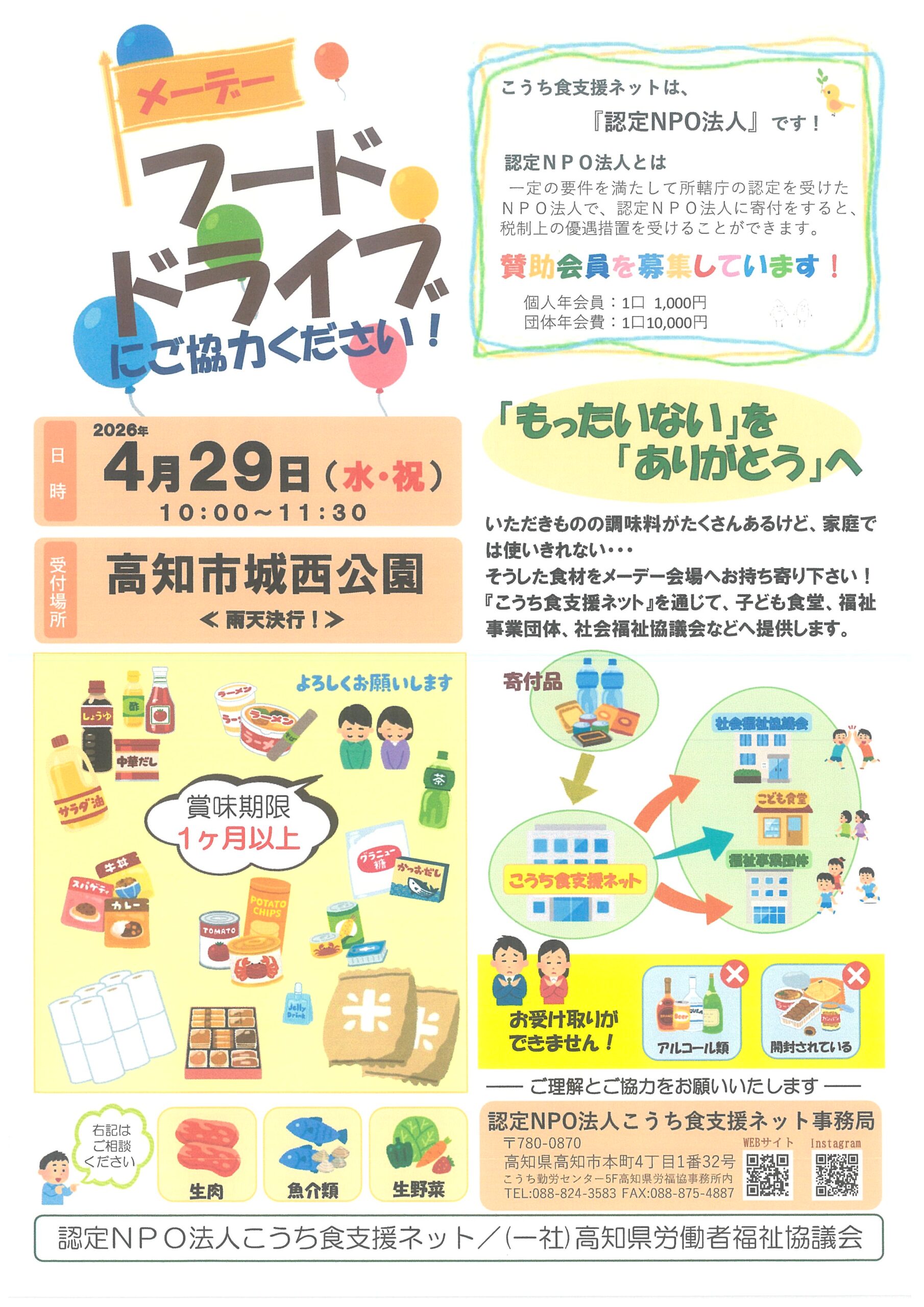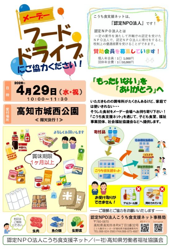 第97回メーデー高知県中央大会 2026年3月30日 日時 2026年 4月29日(水・祝) 午前10時開会 場所 高知市「城西公園」 * 雨天決行 * フードドライブも実施します!! * お子様にはお菓子のプレゼント!!